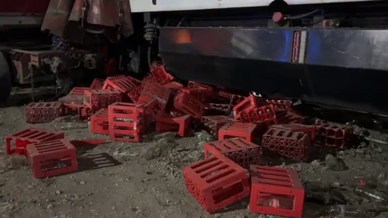 El accidente ocurrió alrededor de las 9 de la noche, cuando el operador del doble remolque intentó ganarle el paso a “La Bestia”. Sin embargo, la locomotora lo alcanzó y prácticamente partió la unidad en dos, dejando la carga regada por toda la zona.