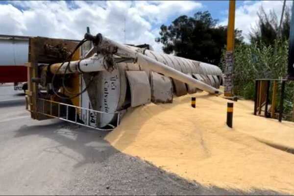 La unidad transportaba aproximadamente 30 toneladas de sorgo, alimento utilizado para gallinas, y circulaba por el Boulevard Morelos. De manera preliminar señalan que al incorporarse al Libramiento, el peso de la carga desestabilizó al vehículo, provocando que terminara volcado sobre el asfalto.