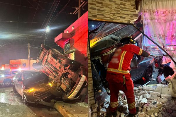 El conductor de una camioneta roja quedó prensado debido al fuerte impacto, pues la unidad fue levantada por el otro vehículo e impactada contra una vivienda con la cabina hacia el muro.
