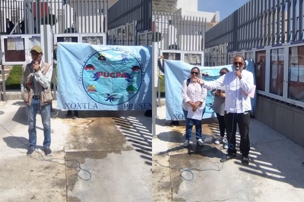 En el mitin realizado en Ciudad Judicial para apoyar a Rogelio Flores y Pascual Bermúdez, los dos habitantes de Xoxtla que tienen órdenes de aprehensión, familiares y asesores legales de dichos pobladores denunciaron irregularidades en los procesos jurídicos en su contra.