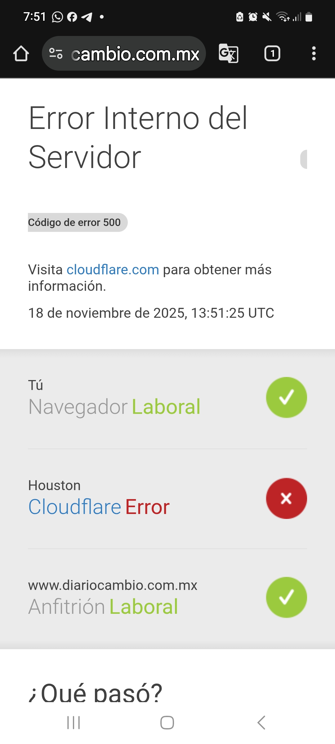 La caída global de la plataforma de protección Cloudfare afectó a diversos portales como: e-consulta, Ambas Manos, MTP, Periódico Central, así como Diario Cambio, Ángulo 7, Intolerancia Diario, El Heraldo de Puebla, por mencionar algunos.