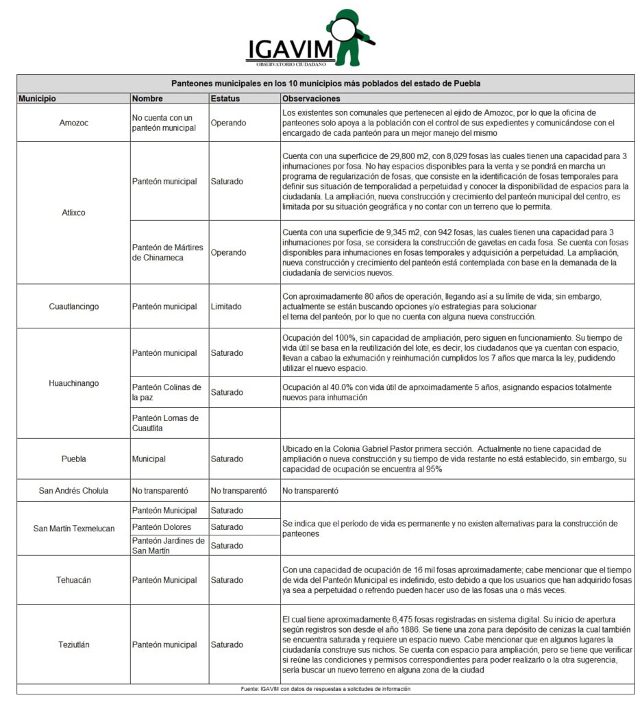 En cuanto a la capital poblana, el Igavim menciona que su panteón situado en la colonia Gabriel Pastor registra el 95 por ciento de ocupación y no tiene capacidad de ampliación.