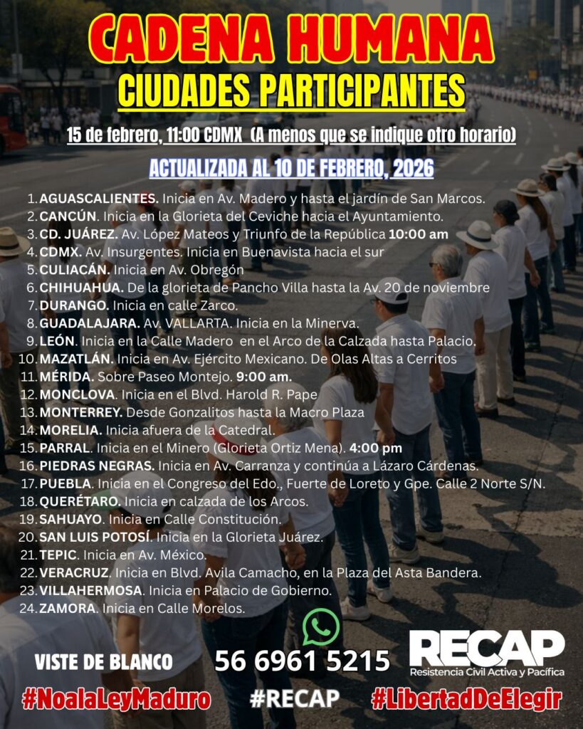 Bajo el eslogan de «No a la Ley Maduro», debido a que argumentan que la reforma en cuestión presuntamente busca imponer un régimen autoritario como el del expresidente de Venezuela, informaron que la cadena humana se llevará a cabo el domingo 15 de febrero a partir de las 11 horas.