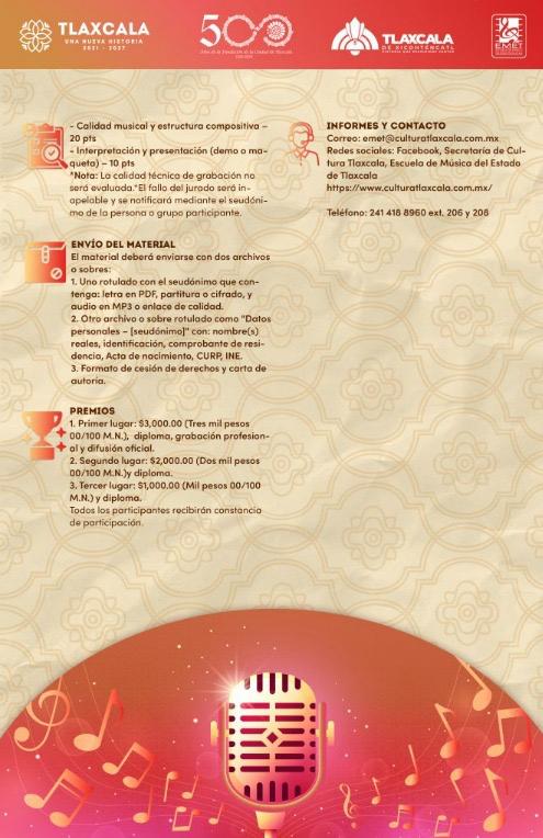 En el marco de la conmemoración por los 500 años de la fundación de la ciudad de Tlaxcala, el Gobierno del Estado, a través de la Secretaría de Cultura de Tlaxcala y la Escuela de Música del Estado (EMET), emitieron la Convocatoria Estatal de Composición Musical “Canción a Tlaxcala 500 años”, con el objetivo de rendir homenaje a la historia, identidad y legado cultural del pueblo tlaxcalteca a través de la música.