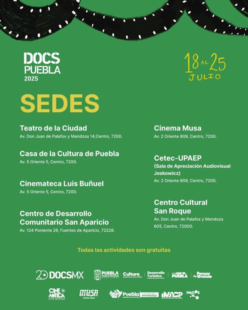 A partir de este viernes 18 de julio y hasta el 25 del mismo mes, se llevará a cabo la octava edición del Docs Puebla, festival de cine enfocado en la proyección de documentales nacionales y locales, que en esta ocasión contará con siete sedes.