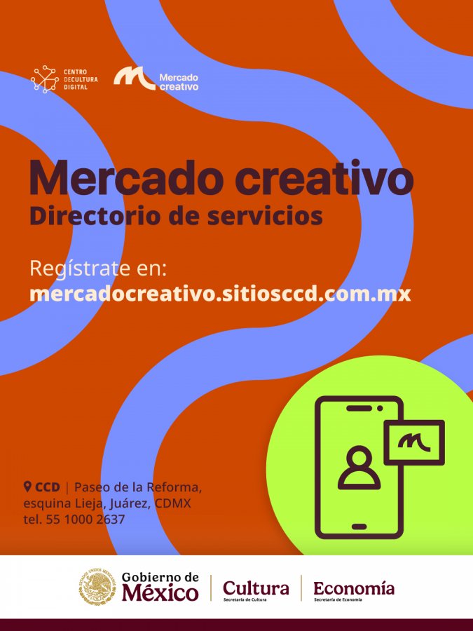 La Secretaría de Cultura del Gobierno de México, a través del Centro de Cultura Digital (CCD) y La Colmena: Centro de Tecnologías Creativas Grace Quintanilla, en colaboración con la Secretaría de Economía y la Secretaría de Cultura de Tlaxcala, invita a la comunidad cultural a formar parte del “Mercado Creativo Digital”, un nuevo directorio público que conectará talento, saberes y servicios del sector creativo en entornos digitales.