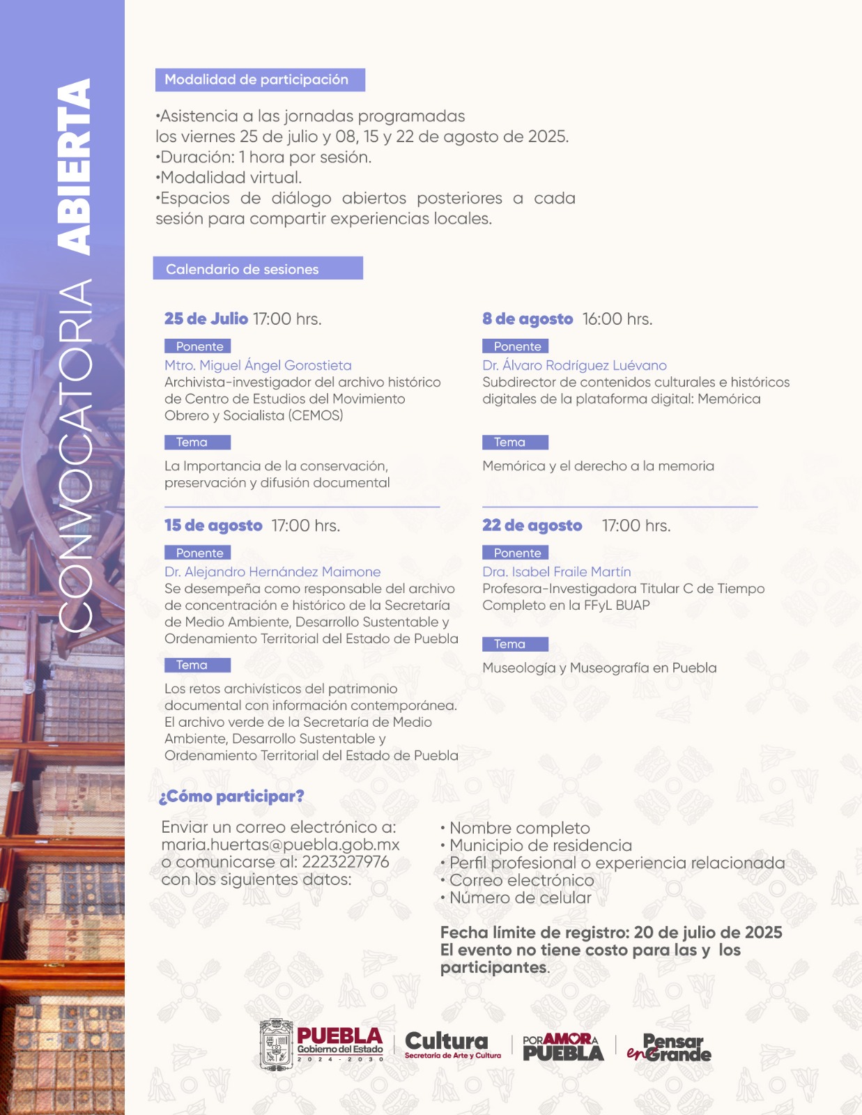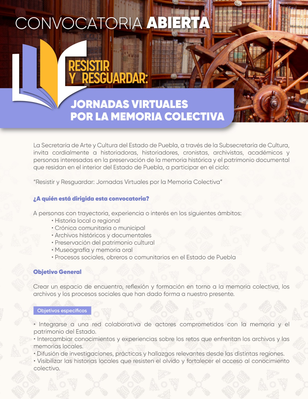 El Gobierno del Estado de Puebla, encabezado por Alejandro Armenta, a través de la Secretaría de Arte y Cultura, abrió una convocatoria para unirse al proyecto “Resistir y resguardar: Jornadas virtuales por la memoria colectiva”. Se trata de una serie de cuatro ponencias que buscan generar una red colaborativa de personas interesadas en dicha temática, mediante su participación en un espacio seguro para el encuentro, la reflexión y la formación de la misma.