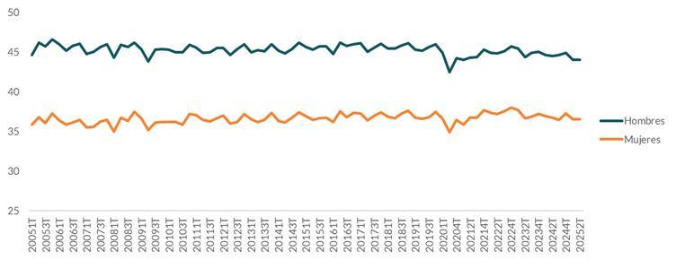 Promedio de horas trabajadas a la semana de mujeres y hombres entre 25 y 64 años, 1T2005-2T2025