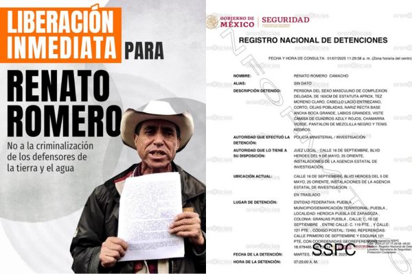 Este martes se dio a conocer la detención de Renato Romero Camacho, integrante del movimiento En Defensa del Agua de la Cuenca Libres-Oriental, que públicamente se ha confrontado con la empresa Granjas Caroll, a la que ha acusado de acaparar el vital líquido de esa región.