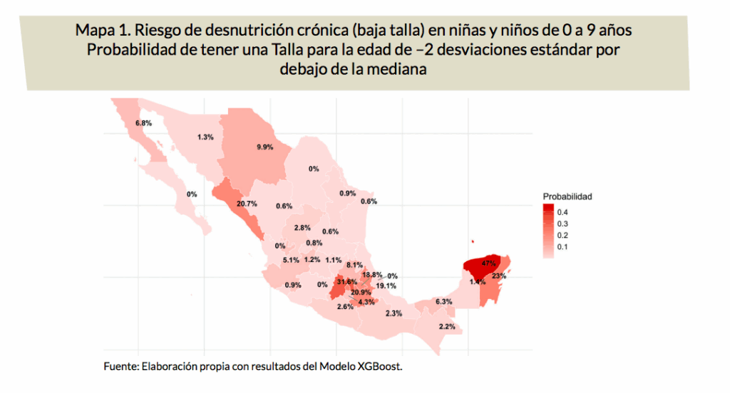 La situación de Nayarit y Baja California Sur es alarmante, al alcanzar porcentajes mayores al 90% de riesgo para la niña o el niño. Otras entidades con porcentajes de riesgo por arriba del 50% de probabilidad son San Luis Potosí, Coahuila y Tamaulipas. Por su parte, Querétaro, Baja California, Michoacán, Guanajuato, Nuevo León, Jalisco, Aguascalientes, Sonora, Veracruz, Durango, Guerrero, Morelos, Zacatecas, Tabasco y Colima, tienen porcentajes de dos dígitos.