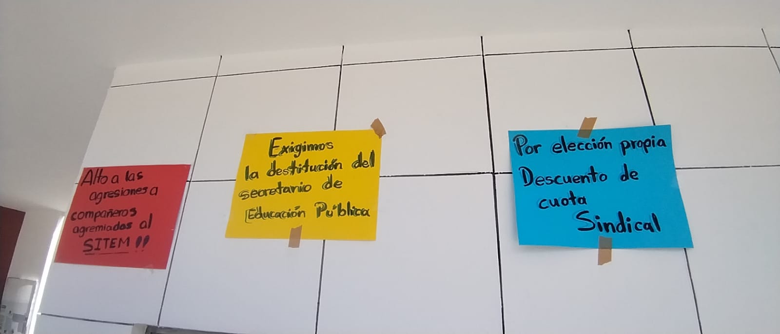 En una de las consignas pegadas en las puertas de acceso, se denunció al supervisor de la zona 20 por presunto acoso laboral contra miembros del Sitem. Igualmente, hubo peticiones más enérgicas como la destitución del titular de la SEP, Manuel Narciso Viveros.