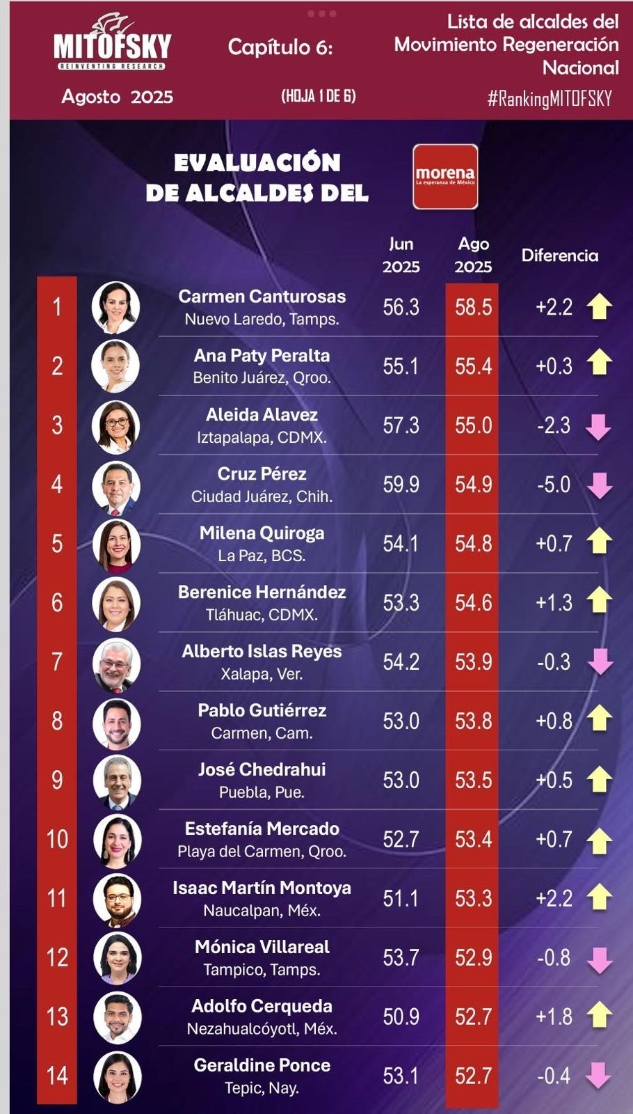En tanto, la mejor evaluada de Morena es Carmen Canturosas, de Nuevo Laredo, Tamaulipas.