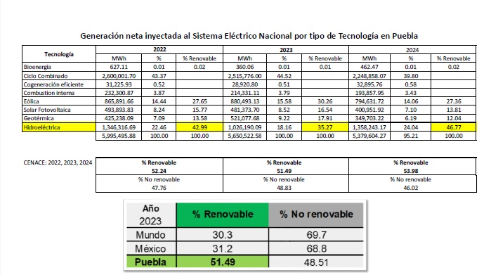 Más de la mitad de la producción de energía del estado de Puebla (51.49%) es renovable, lo que coloca a la entidad por arriba de la media nacional y del promedio mundial.
