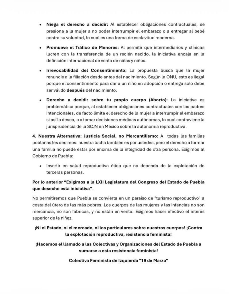 «El derecho de formar una familia no puede estar por encima de la integridad de otra persona. Exigimos al gobierno de Puebla invertir en salud reproductiva ética, que no dependa de la explotación de terceras personas», manifestaron.