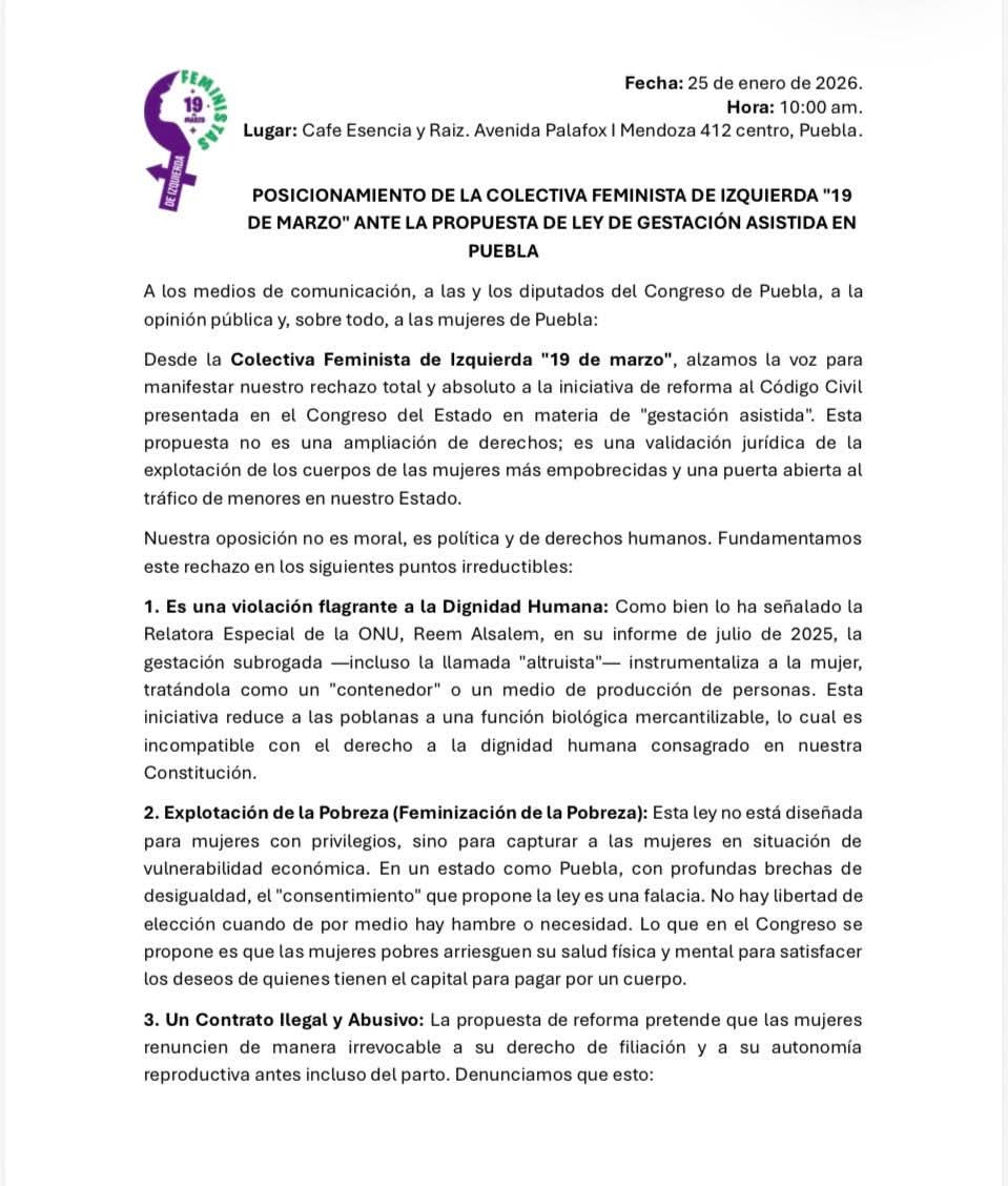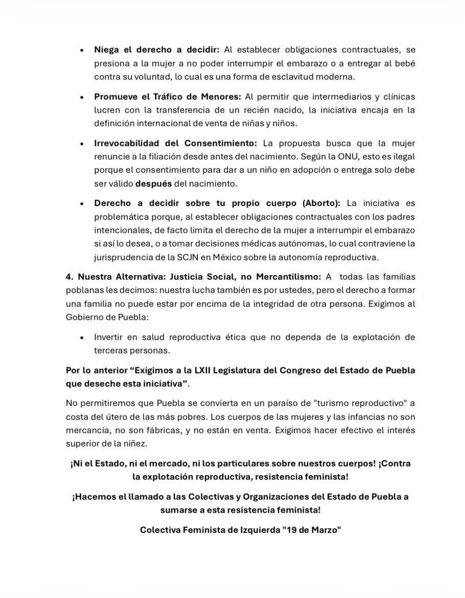 Por otra parte,  la colectiva 19 de Marzo exigió al Congreso de Puebla que deseche la iniciativa de Gestación asistida propuesta en 2025 por la diputada que preside la Comisión de Salud, Nayeli Salvatori Bojalil, pues subrayaron que abre la puerta a la explotación mercantil de los cuerpos de las mujeres en situación de pobreza.