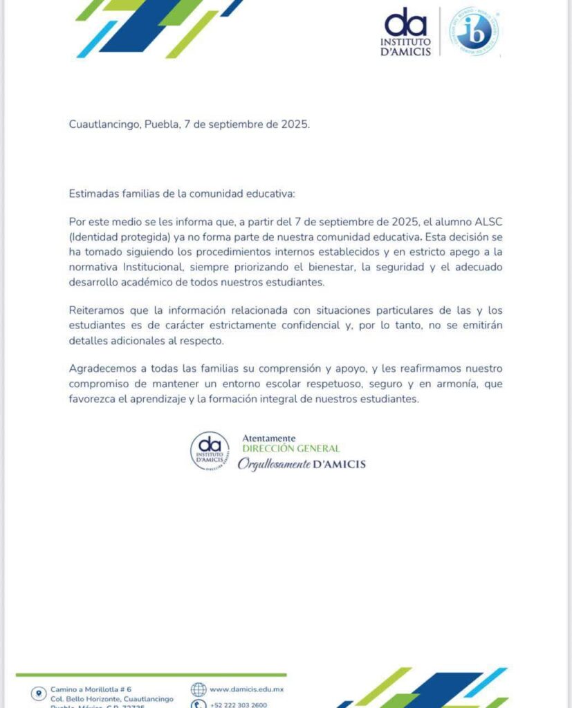 El Instituto D’amicis dio de baja a ALSC del segundo grado de secundaria, señalado por la Fiscalía General del Estado (FGE) de Puebla como autor del asesinato de la argentina y ex funcionaria del Gobierno Estatal, Natalia Andrade, en marzo de 2025, dentro de su domicilio ubicado en el Clúster Parque Querétaro, en Lomas de Angelópolis.