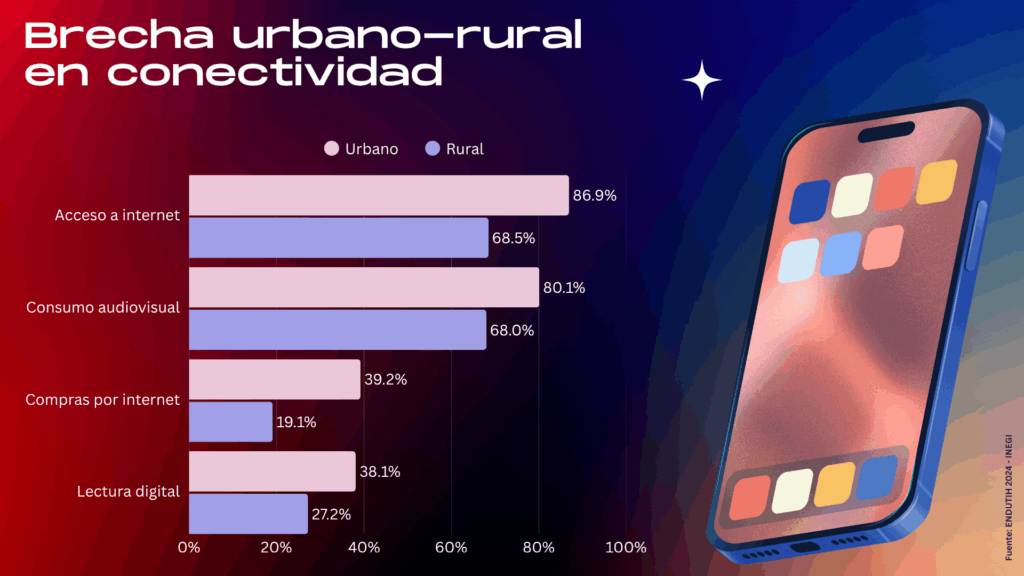 A pesar de este avance generalizado, las diferencias entre zonas urbanas y rurales siguen marcando una brecha importante. Por un lado, en las ciudades el 86.9% de los habitantes tiene acceso a internet, pero en áreas rurales el porcentaje baja al 68.5%. Estas desigualdades también afectan el tipo de actividades realizadas en línea, pues en zonas urbanas, el 80.1% consume contenidos audiovisuales y el 39.2% hace compras por internet; en contraste, en áreas rurales estos números se reducen al 68% y 19.1%, respectivamente.