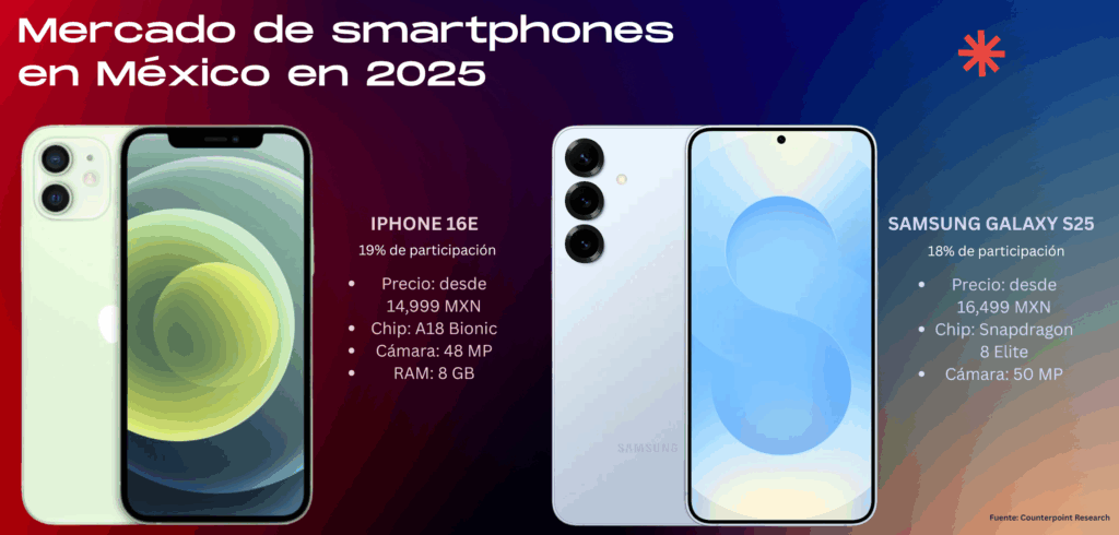 En medio de este escenario, los fabricantes de teléfonos han redoblado esfuerzos para lanzar modelos que combinen potencia y precio justo, adaptándose a las crecientes exigencias de los usuarios digitales. Así, en el primer semestre de 2025, el iPhone 16e se coronó como el preferido en México al acaparar el 19 % de las ventas, de acuerdo con Counterpoint Research. Este dispositivo, situado en la gama de entrada de Apple, destaca por su chip A18 Bionic, sensor principal de 48 MP y 8 GB de memoria RAM, con un precio inicial de 14.999 pesos.