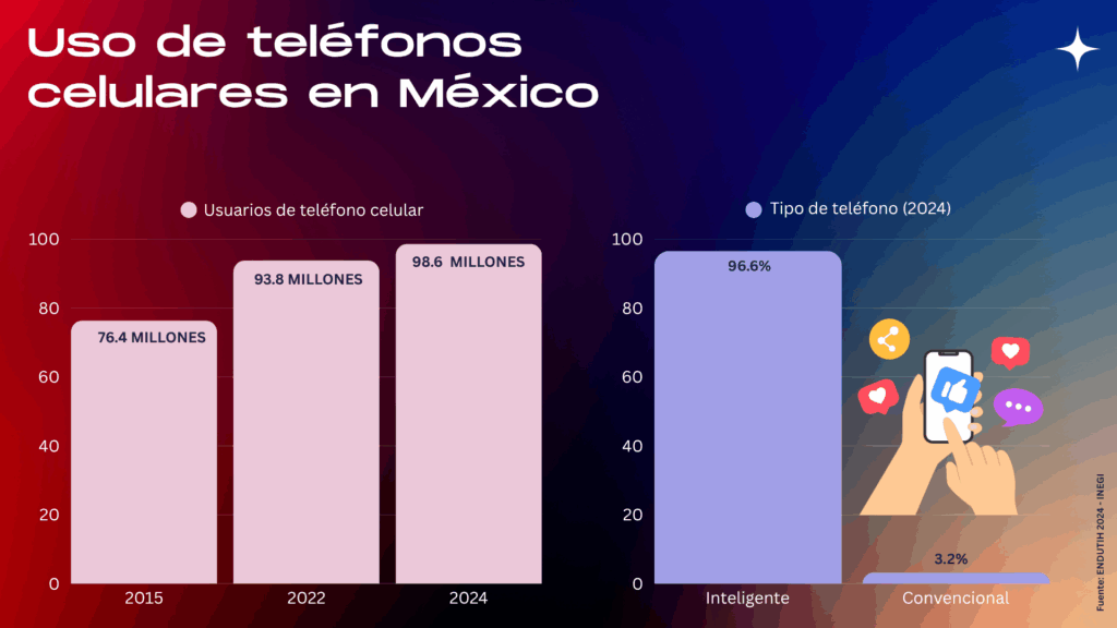 En la actualidad, el celular no solo se utiliza para comunicarse, sino también para acceder a redes sociales, consumir contenidos, comprar en línea y realizar operaciones bancarias y de inversión. En concreto, en 2024, casi la totalidad de los internautas en México -un 93 %- recurrió a su móvil para comunicarse, y un 90.4 % lo utiliza cotidianamente para navegar en redes sociales.