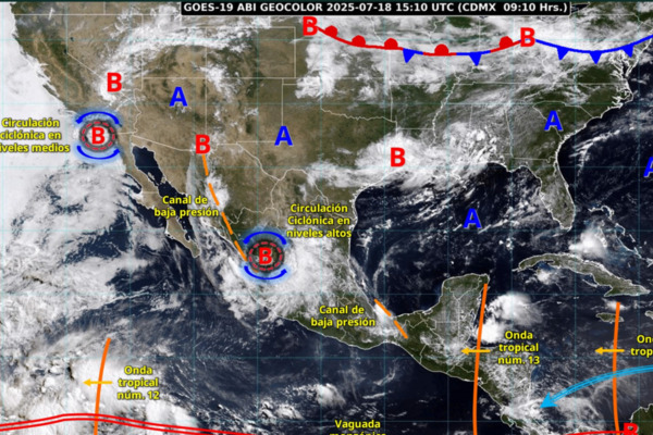 También, la onda tropical número 13 se desplazará del sureste hacia el sur del territorio nacional, mientras una nueva onda tropical se aproxima a la península de Yucatán, generando lluvias de moderadas a fuertes en Oaxaca, Chiapas, Veracruz, Tabasco, Campeche, Yucatán y Quintana Roo.