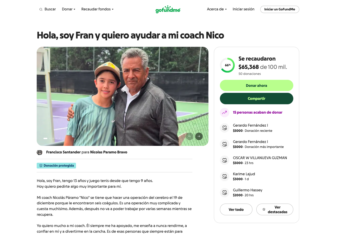 Francisco Santander, un tenista poblano de 13 años, organizó una recaudación en GoFundMe para costear la cirugía cerebral de su entrenador, Nicolás Páramo “Nico”, programada para el viernes 19 de diciembre, luego de que le detectaran seis coágulos en el cerebro.