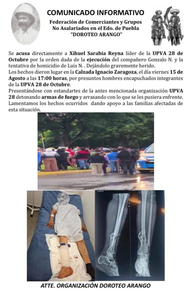 La Federación de Comerciantes y Grupos No Asalariados en el Estado de Puebla “Doroteo Arango” contestó a las acusaciones realizadas por la Unión Popular de Vendedores Ambulantes (UPVA) “28 de Octubre” sobre la balacera registrada en inmediaciones del estadio Cuauhtémoc la tarde del viernes 15 de agosto.