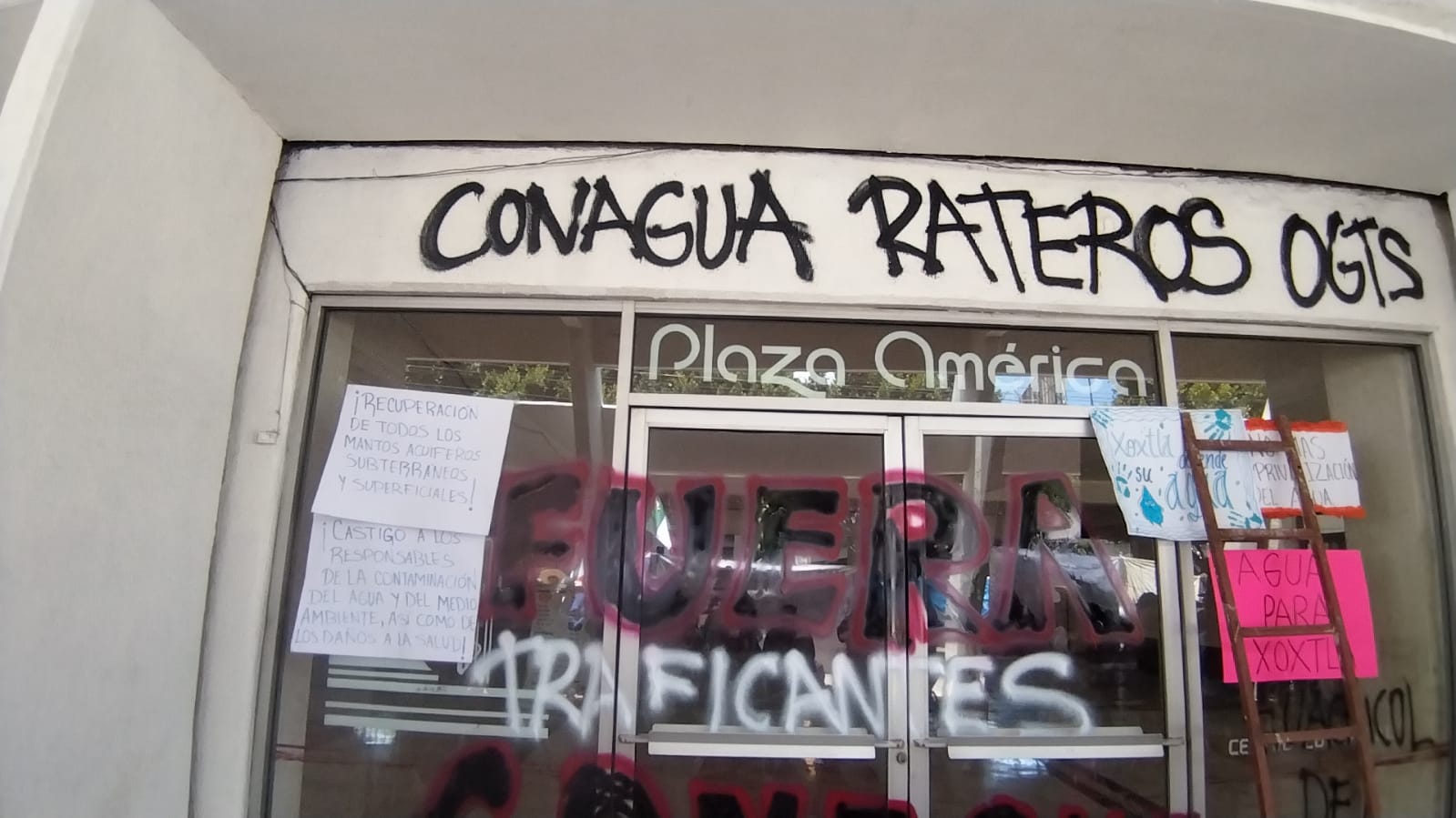 Habitantes de la región cholulteca realizaron un mitin en las oficinas de la Comisión Nacional del Agua (Conagua), en Plaza América, para exigir que dicha comisión ya no se haga cargo de la extracción y suministro del vital líquido en sus comunidades. Durante la protesta las instalaciones fueron vandalizadas.