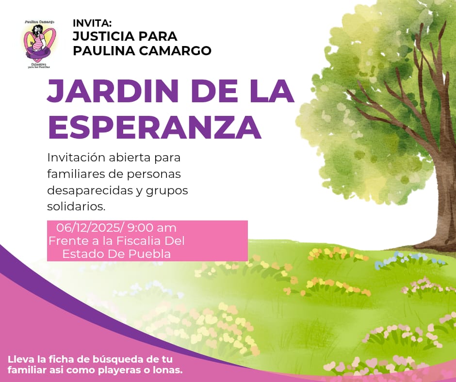 Las agrupaciones Red de Búsqueda de Personas Desaparecidas y Justicia para Paulina Camargo comunicaron que este sábado 6 de diciembre instalarán el Jardín de la Esperanza frente a la Fiscalía de Puebla.
