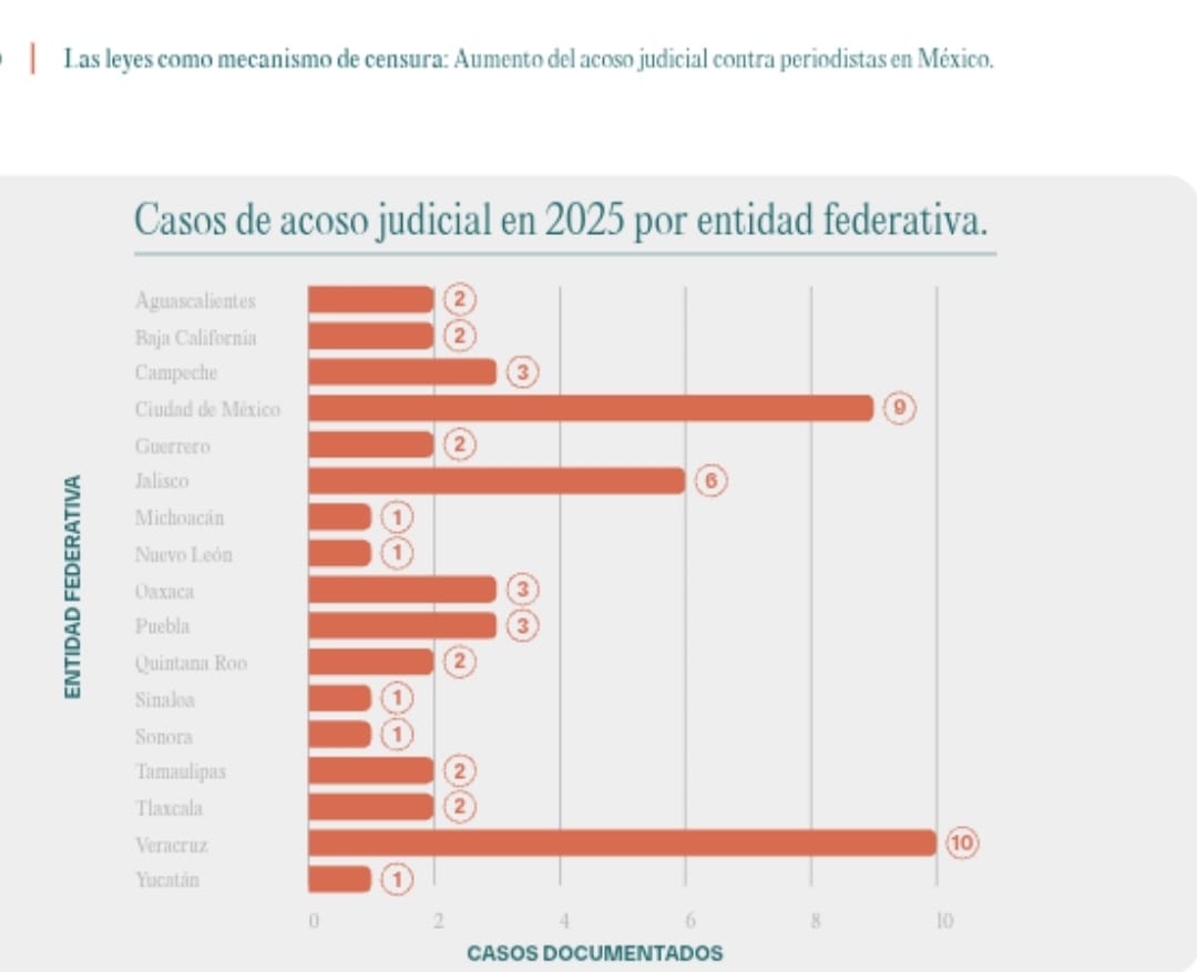 De enero a julio de 2025, Puebla es una de las seis entidades del país con más casos de acoso judicial en contra de periodistas y medios de comunicación, reveló la organización internacional Artículo 19.