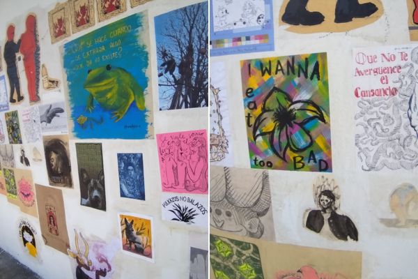 En el espacio en cuestión, hay técnicas de distinta índole, por ejemplo, grabados, dibujos con estencil e impresiones, así como temáticas variadas, entre ellas, reflexiones personales y mensajes de empoderamiento femenino.