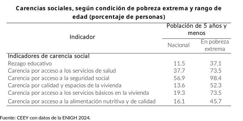 De acuerdo con el Centro de Estudios Espinosa Yglesias (CEEY) y a partir de los datos de la ENIGH, en 2024 el 37.1 % de las niñas y niños de 0 a 5 años en condición de pobreza extrema por ingresos presenta rezago educativo, mientras que, a nivel nacional, para este mismo grupo de edad, es de 11.5 %. Además, en términos de la carencia de acceso a los servicios de salud, el porcentaje para las niñas y niños de 0 a 5 años en condición de pobreza extrema por ingresos resulta de prácticamente el doble en comparación con el dato nacional para el mismo grupo de edad, 73.5 % y 37.7 %, respectivamente. En lo referente a la carencia de acceso a la alimentación nutritiva y de calidad, entre las niñas y niños de 0 a 5 años en condición de pobreza extrema por ingresos, el porcentaje alcanza el 45.7%, mientras que a nivel nacional es del 16.1 %.