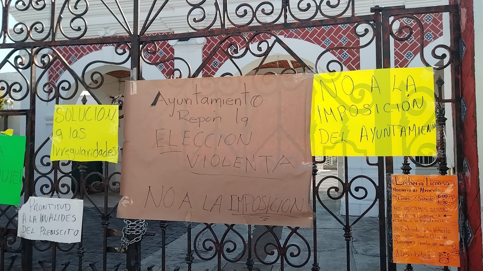 Colgando cartulinas con las consignas «Ayuntamiento repón la elección violenta» y «Solución a las irregularidades», habitantes de San Felipe Hueyotlipan cerraron la presidencia de esa junta auxiliar ubicada en el municipio de Puebla.