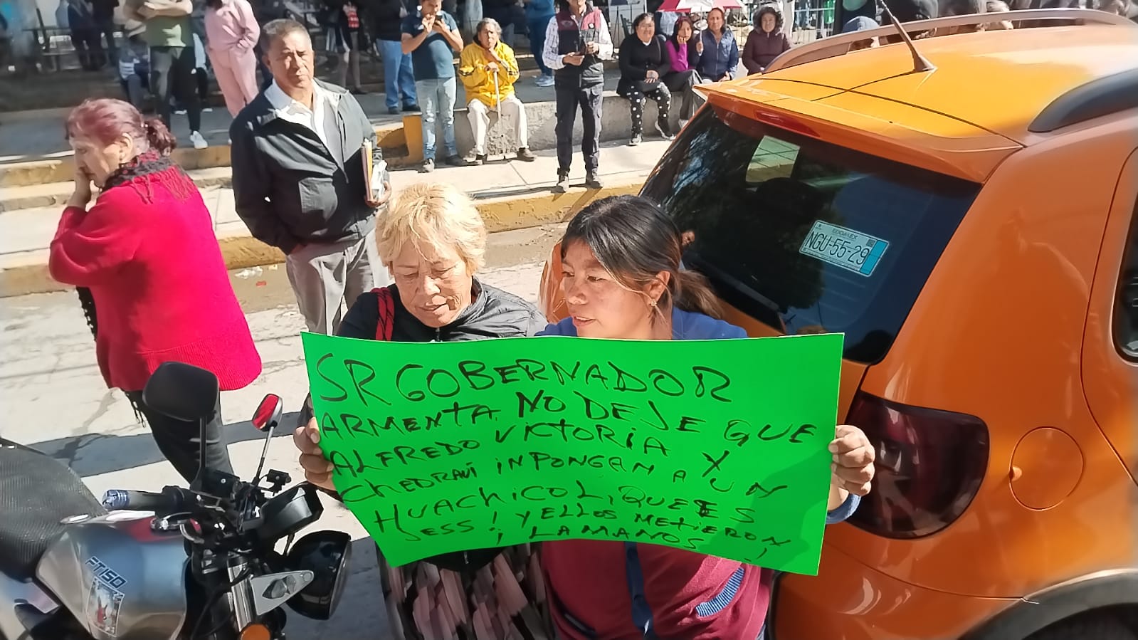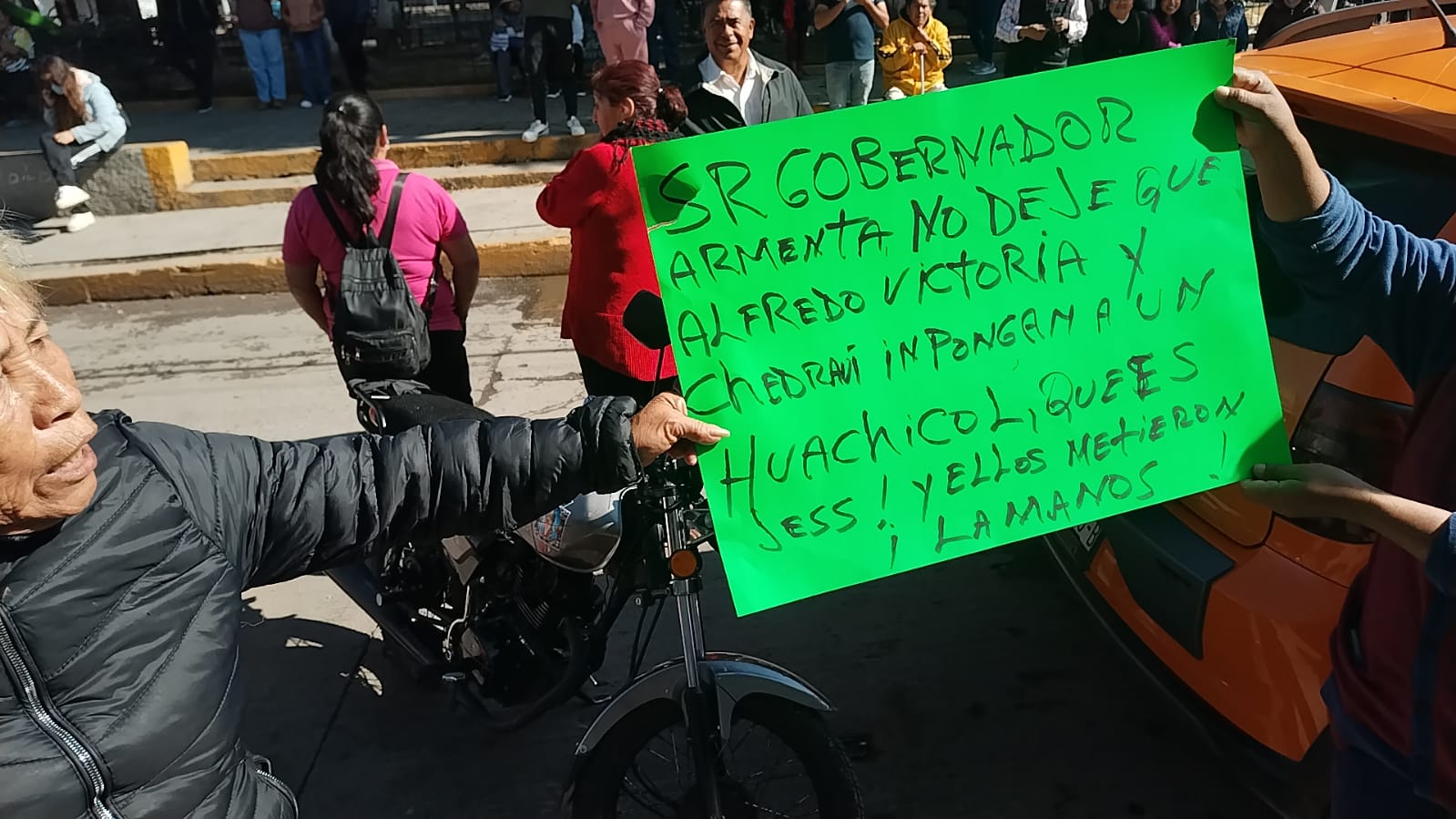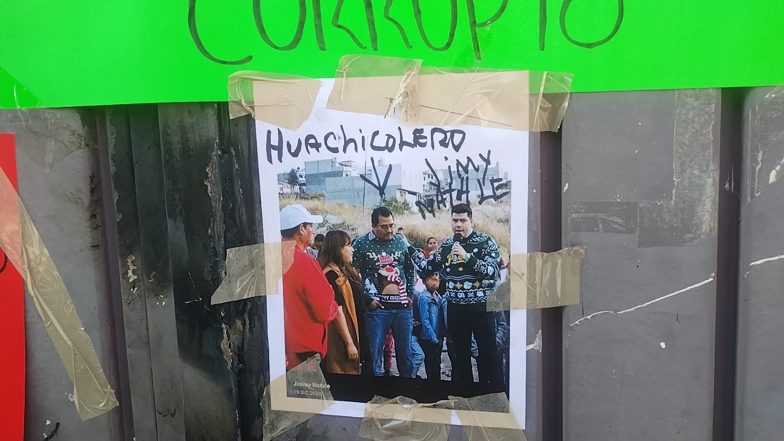 A través de cartulinas, las personas inconformes acusaron a Jezrrel Alcalá Romero de supuestamente dedicarse al huachicol, así como de tener el apoyo del diputado y líder estatal del Partido Verde Ecologista de México, Jaime Natale Uranga.