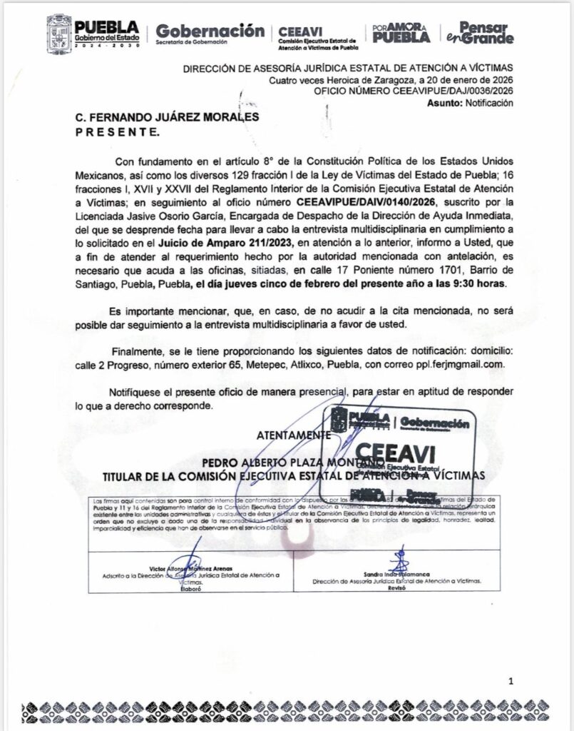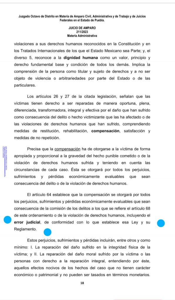 Juárez Morales comunicó a este reportero que el Juzgado 8 de distrito en materia de Amparo civil administrativa y del trabajo y juicios federales del sexto circuito emitió una resolución a favor de su amparo para que la Ceeavi ya no sea omisa a su exigencia.