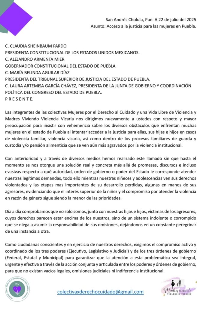 Pidieron apoyo a la presidenta de México, Claudia Sheinbaum Pardo; al gobernador de Puebla, Alejandro Armenta Mier; a la presidenta del Tribunal Superior de Justicia, Belinda Aguilar; y, a la presidenta del Congreso del Estado, Laura Artemisa García Chávez.