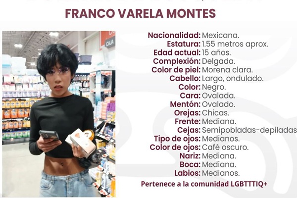 La agrupación Vida Plena pidió el apoyo de la ciudadanía para dar con el paradero de Franco Varela Montes, integrante de la comunidad LGBTTTIQ+, menor de edad, que fue visto por última ocasión en el municipio de Santa Clara Ocoyucan.